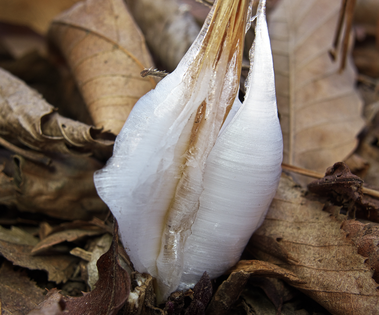 「 霜 柱 」 ※ シソ科シモバシラの根本にできる氷の結晶 平成29年1月25日 快晴 都立水元公園 東京都葛飾区水元公園 レンズ:90mm相当 マクロ 露 出:F5.6 1/125秒 ISO 400 フラットLED |