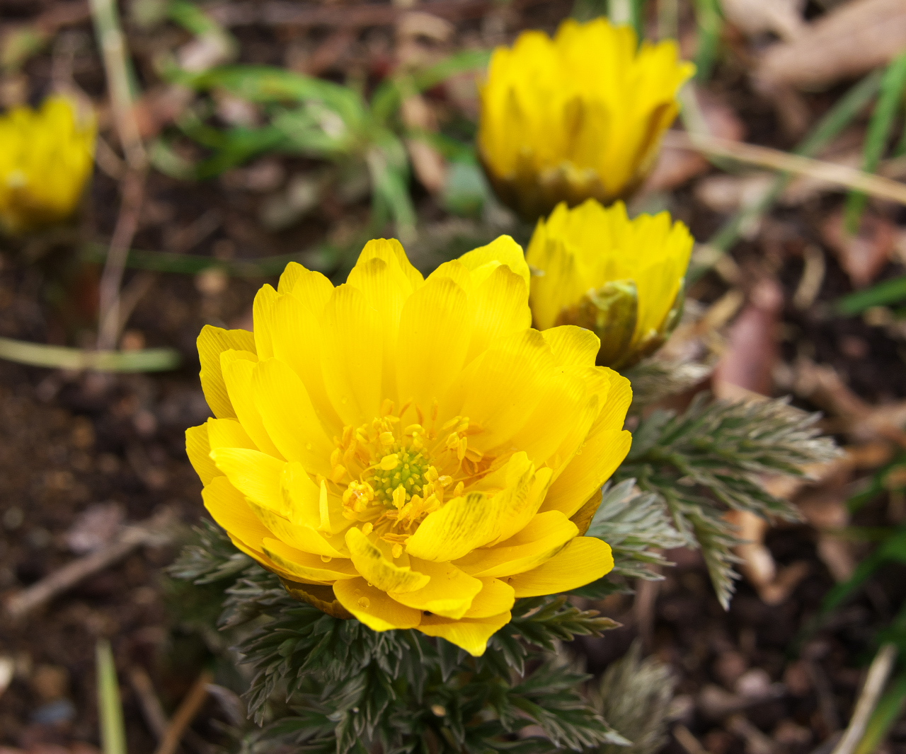 「フクジュソウ」(福寿草) キンポウゲ科 平成22年2月20日 晴れ 向島百花園 東京都墨田区東向島3丁目-18-3 レンズ:280mm相当 露 出:F 5.8 1/250秒 |