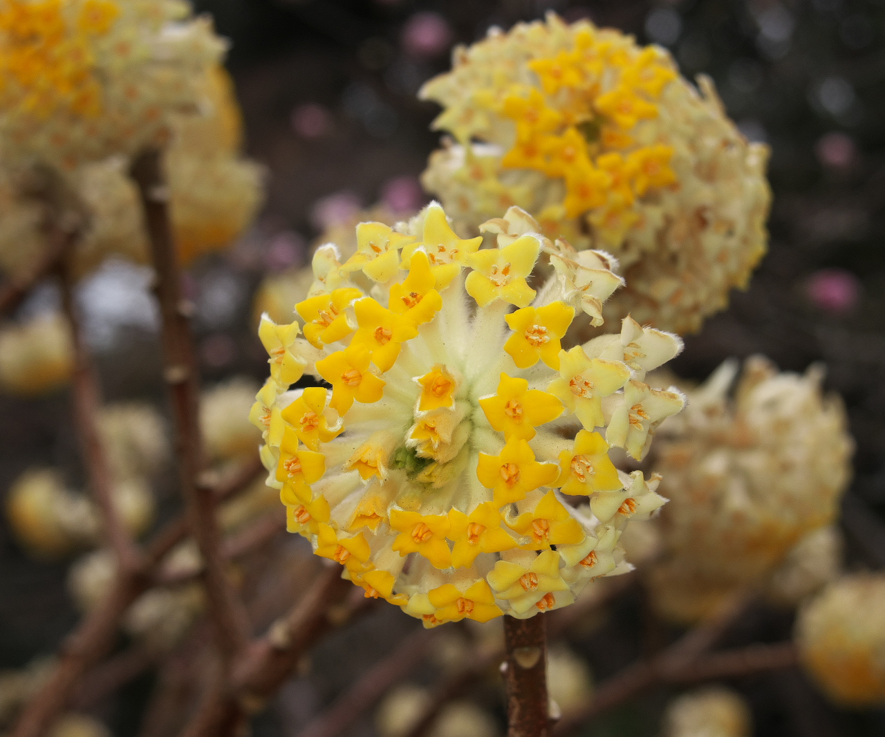 「ミツマタ」(三 俣) ジンチョウゲ科 令和8年 3月17日 くもり 殿ヶ谷戸庭園 東京都国分寺市南町2丁目16番 レンズ:65mm相当マクロモード 露 出:F 3.5 1/500秒 −0.3EV ISO 80 内臓フラッシュ M 1/64 ディフューザー LEDライト |